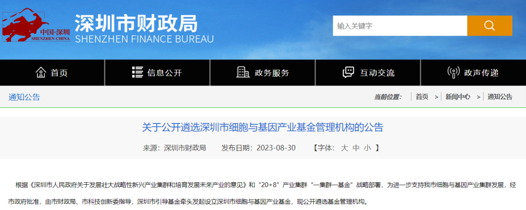 8月30日,深圳市財政局發布了《關于公開遴選深圳市細胞與基因產業基金管理機構的公告》。