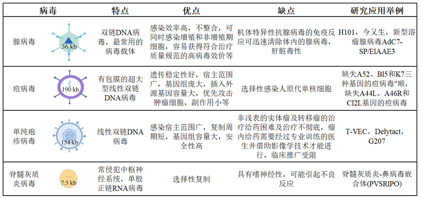 已有許多不同類型病毒被用于溶瘤病毒的開發(fā),如腺病毒(AdV)、單純皰疹病毒 (HSV)、牛痘病毒(VV)、呼腸孤病毒 (RV)、新城疫病毒 (NDV)、麻疹病毒 (MeV)、脊髓灰質(zhì)炎病毒(PV)和柯薩奇病毒(CV)等。目前已經(jīng)獲得監(jiān)管批準(zhǔn)的溶瘤病毒主要來自HSV 和AdV 家族,其中FDA批準(zhǔn)的T-VEC和PMDA批準(zhǔn)的Delytact均為1型單純皰疹病毒,NMPA批準(zhǔn)的今又生和H101則分別為重組p53腺病毒和重組5型腺病毒。