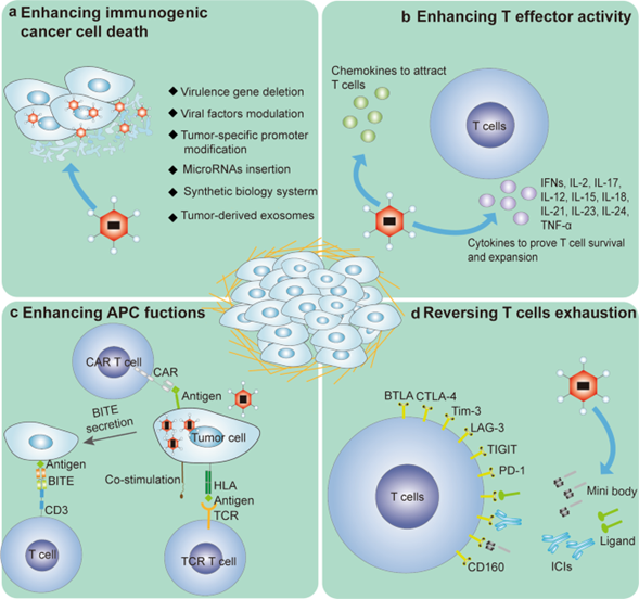 - 往病毒基因組添加趨化因子基因(如CCL5、CXCL11),從而在腫瘤細(xì)胞中表達(dá)趨化因子,增強(qiáng)免疫細(xì)胞遷移和浸潤(rùn),將“冷”腫瘤轉(zhuǎn)變?yōu)?ldquo;熱”腫瘤。