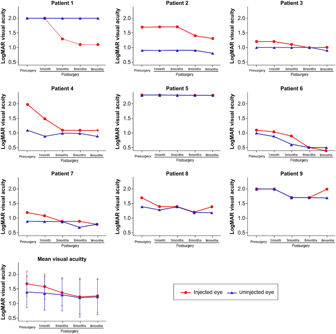 紐福斯生物于2011年在啟動試驗性NR082基因治療的IIT臨床試驗。在參與試驗的9例ND4位點突變LHON患者中,7例者的視力得到明顯改善,最佳視力恢復到0.8,9名患者平均最佳矯正視力提高0.39logMAR(即接近字母表四行的提高)。8名患者完成了近8年的長期隨訪,無嚴重不良反應事件。2021年1月,紐福斯遞交NR082的IND申請,成為國內首款申報臨床的AAV基因療法。