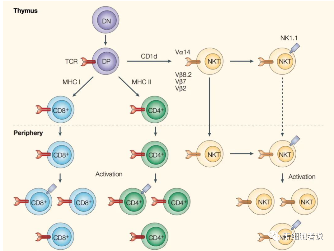 NKT細胞共表達T細胞受體(CD3)和NK細胞受體(NK1.1)。在胸腺內(nèi),NKT細胞與T細胞的發(fā)育過程極為相似,在CD4+CD8+雙陽性(DP)選擇階段中,NKT細胞獨立發(fā)育出來,經(jīng)過CD1d選擇(NKT細胞與由CD1d遞呈的糖脂相互作用),大多數(shù)向著NKT細胞系(CD4+NKT或CD4-CD8-NKT)發(fā)育,而CD8+NKT細胞則不依賴CD1d。